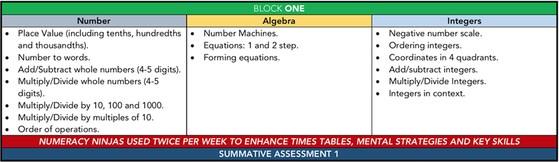 Each block has three parts: number, algebra and another strand. Number and algebra are hugely important strands of mathematics and having opportunities to generalise was important to me when sequencing topics. Each block required mastery to be met or future topics would provide problematic. Teachers have complete autonomy to work across the block left to right, right to left or to be honest whatever is best for the pupils in front of them. Professional autonomy is the foundation upon the re-design of our curriculum and I was keen to foster the ethos of doing what is best for the pupils. We grouped the pupils by prior attainment, although not solely based on primary information and we ran diagnostic quizzes to ensure we had accurate data to determine where each child should start on their journey to learning mathematics at secondary school. In the interests of brevity, I go into much more detail on this in my conference presentations, but I must stress that the groupings were very flexible and I would regularly move pupils from class to class based on the judgement of the teacher. I used a model whereby once grouped, the teacher would keep this class for a minimum of four years. Relationships are critical in schools and even more so in secondary; short 50 minute periods are a significant change for pupils and in some cases, we don't see them each day.